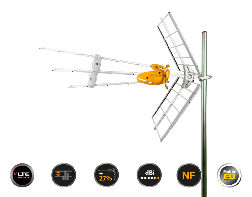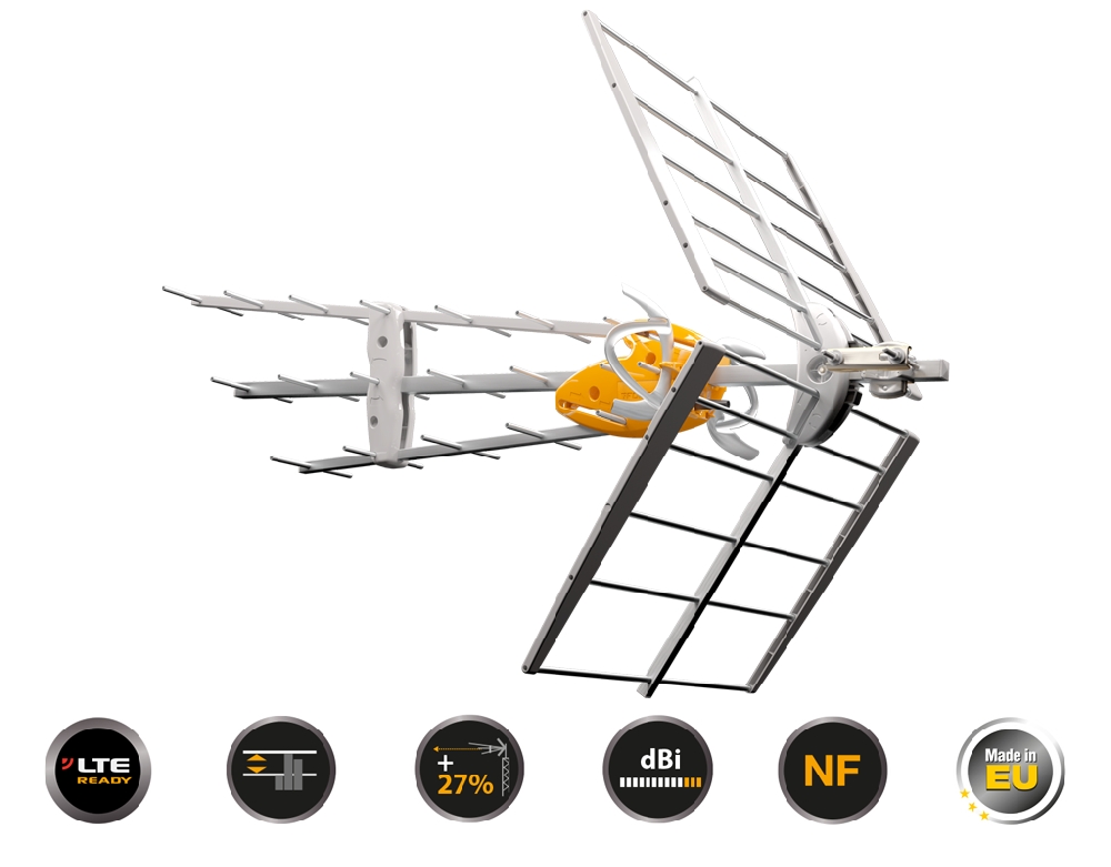 - Παθητική (χωρίς dc 12-24v), Ενεργή T-Force λειτουργία (με παροχή dc 12-24v), για μεγιστοποίηση του δυναμικού εύρους και ιδανική λήψη τόσο σε σημεία πάρα πολύ ασθενών σημάτων, όσο και σε σημεία με υπερβολικά ισχυρό σήμα λήψης.