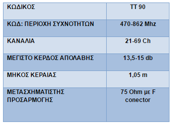 Ψηφιακή κεραία τηλεοράσεως UHF (digital TV antenna), τελευταίας τεχνολογίας της εταιρείας μας Condor antennas. Η κεραία «ΤΡΙΠΛΗ» βγαίνει σε τρία μεγήθη: ΜΙΚΡΗ, ΜΕΣΑΙΑ και ΜΕΓΑΛΗ. Πρόκειται για μια κεραία κατασκευασμένη από αλουμίνιο υψηλής αντοχής και σε γωνιακή διάταξη τριών δοκών. Χαρακτηριστικά που δίνουν στην κεραία κεραία πολύ καλή σχέση μεγέθους – απολαβής.